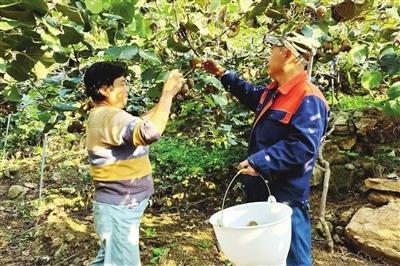 劉樹成和妻子采摘自家果園的獼猴桃