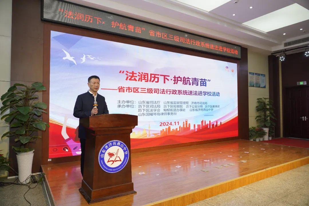 為貫徹落實山東省未成年人違法犯罪綜合治理工作座談會精神,切實發(fā)揮普法工作在未成年違法犯罪中的源頭預(yù)防作用,11月11日,省市區(qū)三級司法行政系統(tǒng)組織開展的“法潤歷下·護(hù)航青苗”送法進(jìn)學(xué)?;顒釉谘嗌街袑W(xué)正式啟動。山東省司法廳黨委委員、副廳長,省監(jiān)獄局黨委書記、局長王發(fā)軍出席活動。