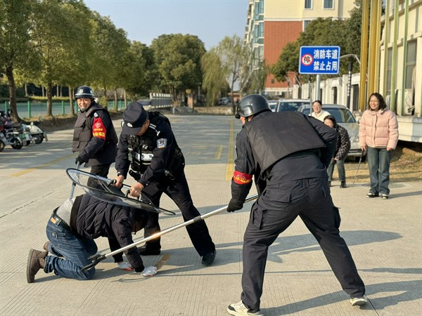 演練期間,一名佯裝以探視幼兒為借口的“歹徒”,手持器械妄圖強行闖入校園。面對這一“不速之客”,校園保安迅速反應,當即對歹徒予以勸阻,并即刻啟動一鍵報警系統向公安機關報警,同時向園內應急指揮部匯報情況。相關責任教師在警報拉響后,迅速且有條不紊地將正在戶外開展活動的幼兒疏散至安全地帶。應急小組、校園保安與在場民警緊密協作,運用防暴盾牌筑起堅固防線進行格擋防御,借助鋼叉巧妙干擾歹徒的行動。憑借彼此間的高度默契配合,逐步縮小對歹徒的包圍圈。在全體現場人員的齊心協力之下,最終成功將歹徒制服。整個演練流程各個環(huán)節(jié)緊密銜接、有條不紊,順利達成預期目標。