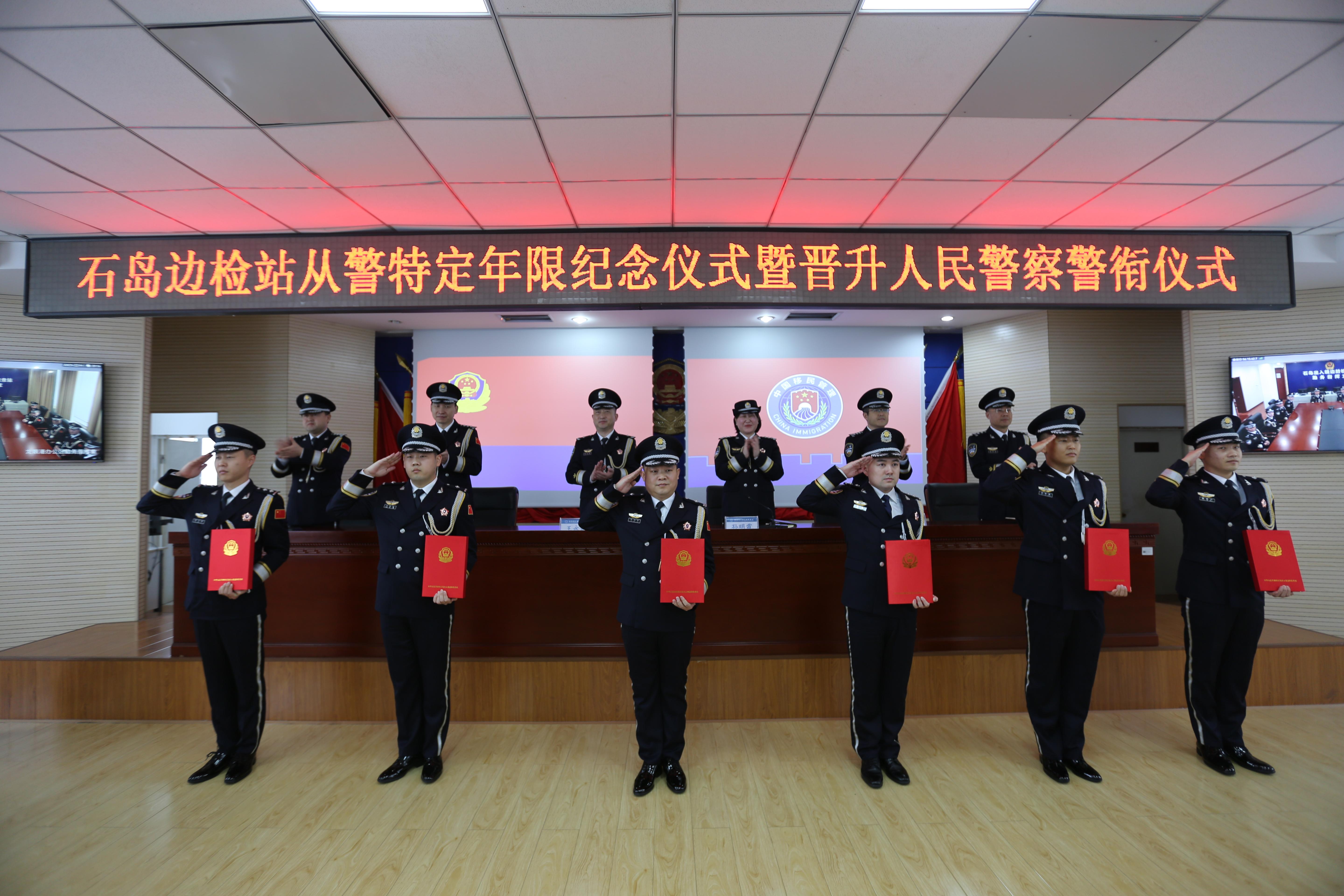 隨后,站黨委書記、站長王永春同志代表站黨委向從警特定年限和晉升警銜民警職工表示祝賀,他指出,授予晉升警銜是組織的激勵,也是黨和人民更大的信任,希望晉銜人員要心無旁騖干好主責(zé)主業(yè),時刻把使命放在心上、把責(zé)任扛在肩上,與最優(yōu)對標、與強者比拼、與快者賽跑,主動迎接挑戰(zhàn)、經(jīng)歷考驗、接受檢驗,以嶄新面貌和優(yōu)異業(yè)績?yōu)樽约旱膹木脑鎏硇碌墓獠?。最后,全體民警重溫了公安機關(guān)人民警察誓詞,并拍照留念。(石島出入境邊防檢查站 畢凱珺 崔浩 常亮)