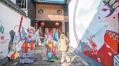在浙江省金華市鄭店村婺劇非遺主題館,村劇團(tuán)老師給游客指導(dǎo)婺劇基本動(dòng)作。楊梅清 攝