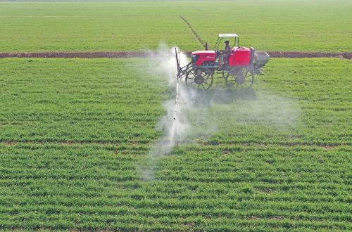 安徽農墾華陽河農場開展社會化服務的田地里,農機手正在進行小麥植保作業(yè)(受訪者供圖)