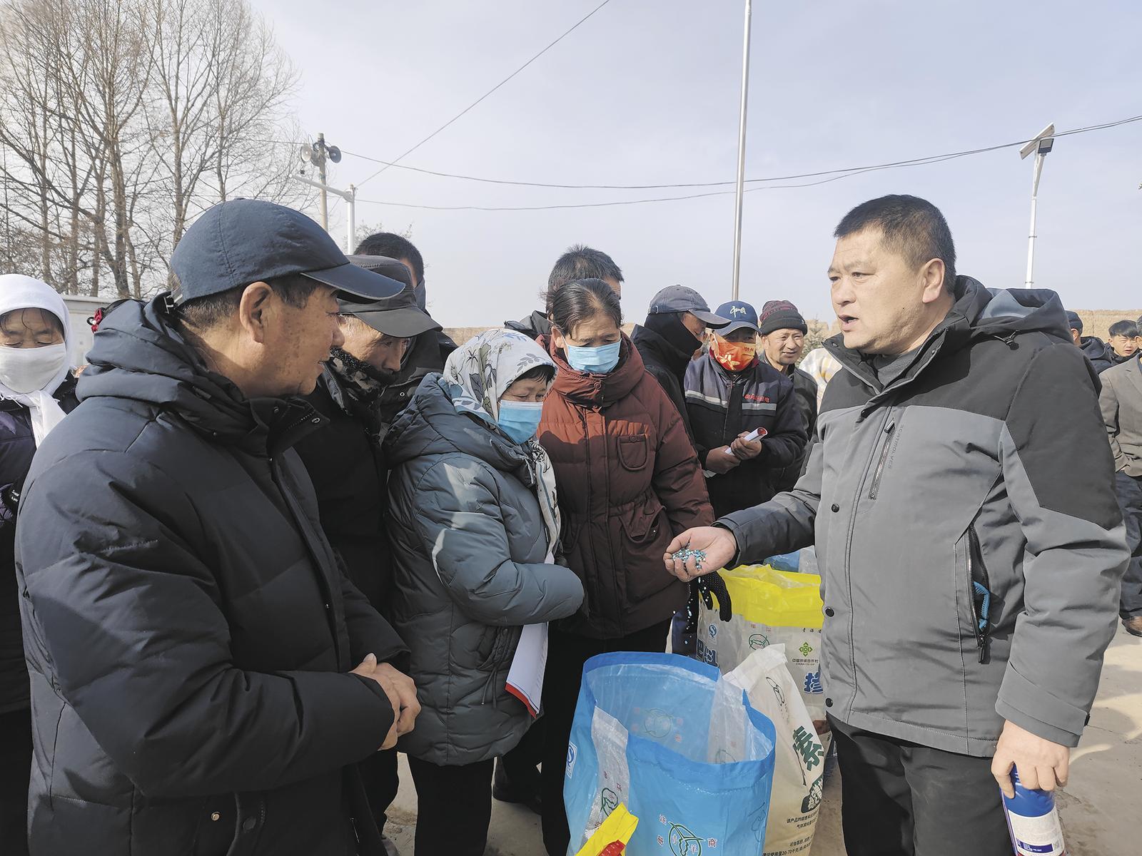 宣講現(xiàn)場(chǎng),工作人員向群眾介紹新型肥料和農(nóng)藥。記者 丁玉梅 攝