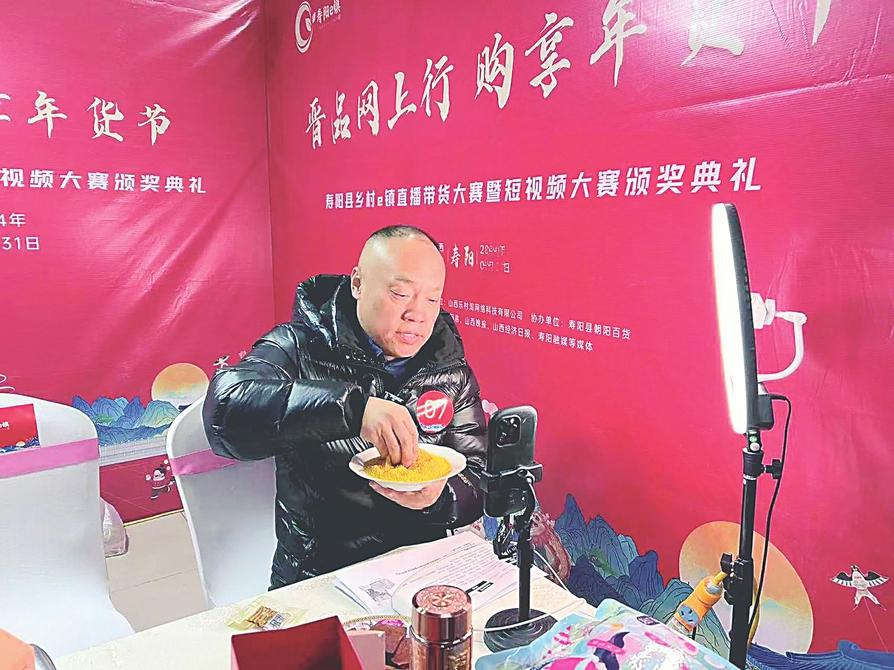 壽陽縣鄉(xiāng)村e(cuò)鎮(zhèn)直播帶貨大賽中,參賽人員正在直播銷售地方農(nóng)產(chǎn)品(資料圖片)