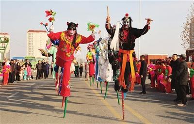 春節(jié)前夕高莊戶村村民進(jìn)行高蹺表演。資料照片