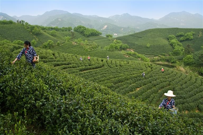 信陽茶山,采摘春茶。