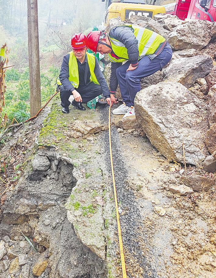 3月14日,秭歸縣芝茅公路,保險公司工作人員在災毀路段進行查勘核災。記者 柯皓 通訊員 王耿 攝