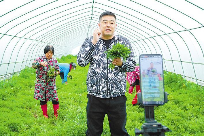 3月28日上午,應(yīng)南村村支書劉勇正在蔬菜大棚中為新鮮藜蒿直播帶貨。(洪湖市委宣傳部供圖)