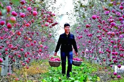 延安市安塞區(qū)南溝村村民張杰在果園搬運(yùn)蘋(píng)果。祁小軍 攝