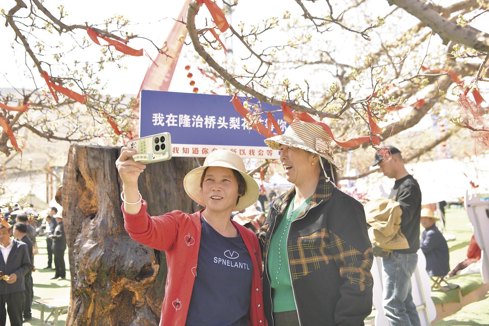 游客在梨花下拍照留念。記者 牛玉嬌 攝