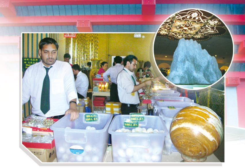 在2010上海世博會(huì)巴基斯坦館內(nèi),可見(jiàn)形態(tài)各異的玉石作品。右上為“假山”。馬霞 攝