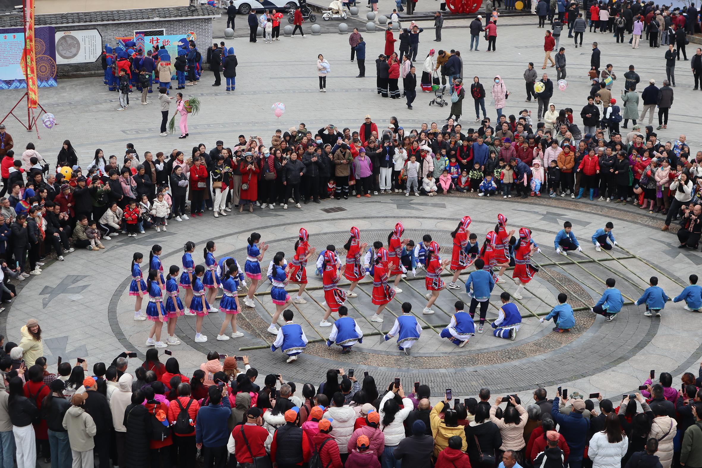 廣東各地還積極探索“村晚+”特色節(jié)慶活動(dòng),匯聚四方人氣、促進(jìn)文旅融合?!按蟊娎▔颜Z(yǔ),意為大家好),壯家有個(gè)三月三,三月初三歌墟節(jié)呀歌墟節(jié)……”2025年全國(guó)“四季村晚”春季示范展示活動(dòng)——廣東連山“三月三”壯族歌墟節(jié)活動(dòng)在清遠(yuǎn)連山壯族瑤族自治縣小三江鎮(zhèn)舉行,粵湘桂三?。▍^(qū))的民間“歌王”同臺(tái)斗歌。此次活動(dòng)共有2.67萬(wàn)人次參與,帶動(dòng)消費(fèi)1428.45萬(wàn)元。