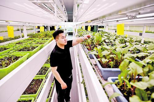 4月30日,冀州現(xiàn)代農(nóng)業(yè)融合創(chuàng)新基地植物工廠,農(nóng)技員在查看蔬菜長(zhǎng)勢(shì)。