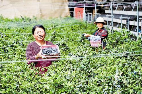4月30日,北京新發(fā)地助力鄉(xiāng)村振興(冀州)示范園區(qū),工人高興地展示剛采收的藍(lán)莓。