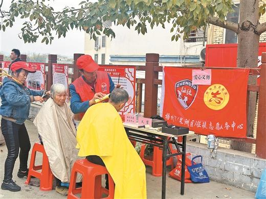 興龍街道平浪村志愿者服務(wù)隊(duì)在老區(qū)廣場(chǎng)開展愛心義剪。(長洲區(qū)融媒體中心供圖)