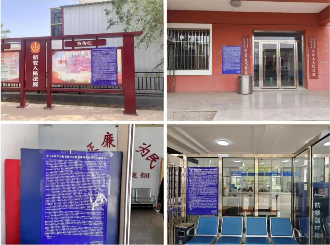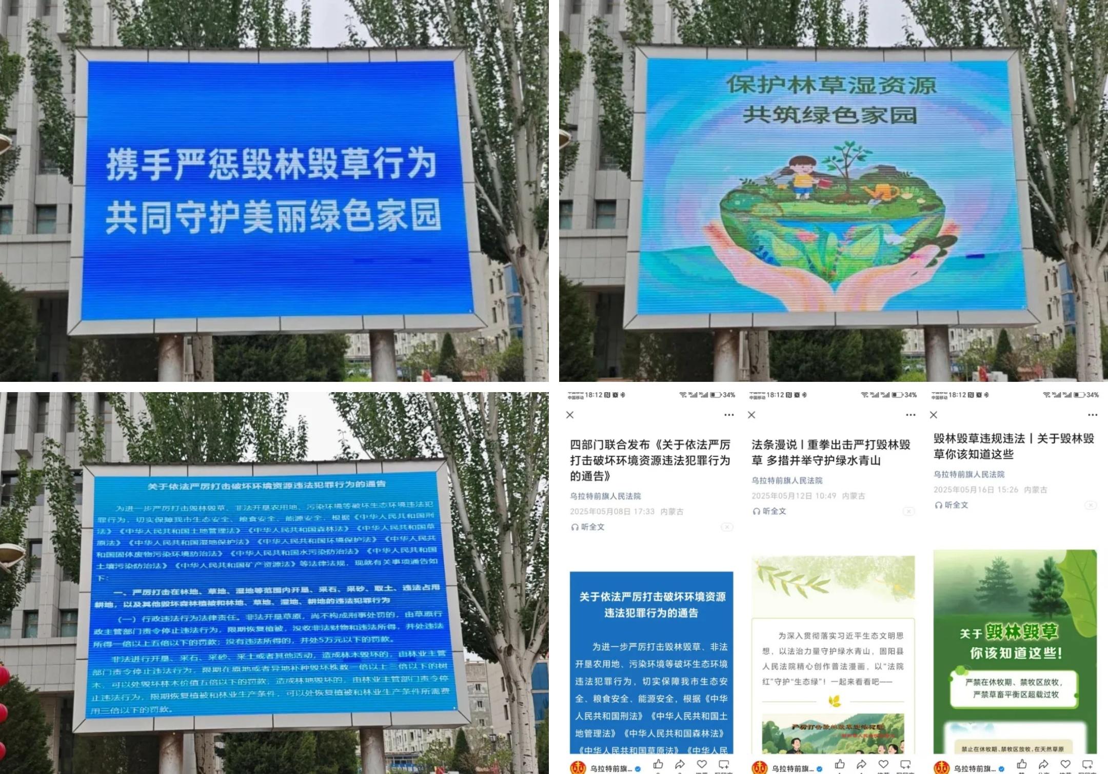 為鞏固宣傳成效,營造濃厚宣傳氛圍,烏拉特前旗人民法院開展了形式多樣的宣傳舉措。一是利用戶外LED電子顯示屏圍繞毀林毀草主題每日循環(huán)播放圖片及視頻;二是同時在5個基層法庭公示欄等顯眼位置張貼《關于嚴厲打擊毀林毀草違法犯罪行為的通告》等海報10余張;三是積極利用微信公眾號等多媒體平臺,轉發(fā)有關毀林毀草的相關文章及法律條文,引導群眾從“被動守法”轉向“主動護綠”。