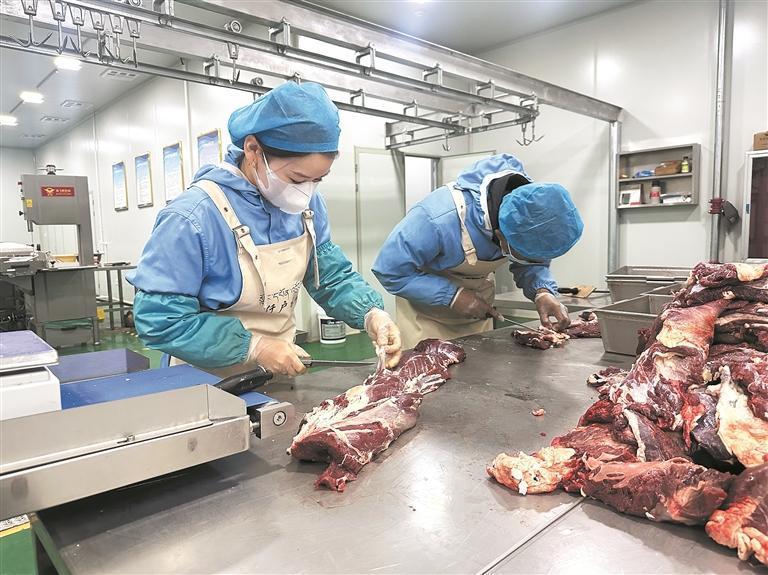 “一只成年藏羊在經(jīng)過檢疫達(dá)標(biāo)屠宰后,先送至排酸間用保鮮排酸技術(shù)進(jìn)行排酸,再被送進(jìn)這里分割加工、剔骨、修割?!鼻獞裟翀黾庸ぼ囬g工作人員馬玉梅介紹說。只見她手持專用刀具,沿著羊肉的肌肉紋理精準(zhǔn)下刀,將藏羊按部位分割成精品羊肋排、羊腿肉(帶骨)、羊脖片等不同區(qū)塊。隨后,新鮮的藏羊肉被快速分揀至不同區(qū)域,有的進(jìn)入真空包裝機(jī)完成封裝,有的則被送往進(jìn)一步加工的流水線。車間里機(jī)器運(yùn)轉(zhuǎn)的低鳴聲與工作人員專注的動作交織,每一個(gè)環(huán)節(jié)都嚴(yán)格遵循衛(wèi)生標(biāo)準(zhǔn),確保肉類從分割到成品的全程安全。