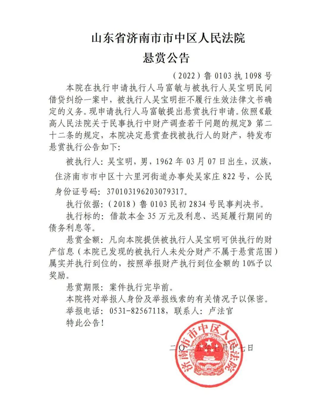 本院在執(zhí)行申請(qǐng)執(zhí)行人馬富敏與被執(zhí)行人吳寶明民間借貸糾紛一案中,被執(zhí)行人吳寶明拒不履行生效法律文書確定的義務(wù)。現(xiàn)申請(qǐng)執(zhí)行人馬富敏提出懸賞執(zhí)行申請(qǐng)。依照《最高人民法院關(guān)于民事執(zhí)行中財(cái)產(chǎn)調(diào)查若干問題的規(guī)定》第二十二條的規(guī)定,本院決定懸賞查找被執(zhí)行人的財(cái)產(chǎn),特發(fā)布懸賞執(zhí)行公告如下: