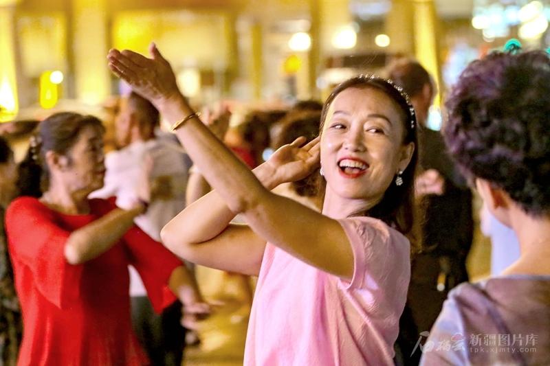 各族群眾在奇臺(tái)古城商業(yè)街旁的廣場上跳舞(7月4日攝)。記者 蔡增樂 攝