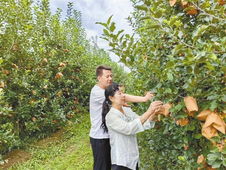 7月23日,韓英杰(左)在蘋果園里指導(dǎo)群眾管護果樹。記者 李靜茹 攝