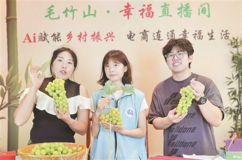 “陽光玫瑰葡萄皮薄肉脆,汁水豐盈……”在全州毛竹山幸福直播間,主播李清清和助手正捧著新鮮葡萄向網(wǎng)友熱情推介,為即將大量上市的毛竹山葡萄造勢(shì)。