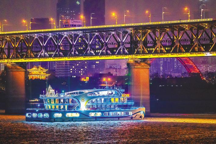 游客乘坐長江榮耀號游輪欣賞江城夜景。