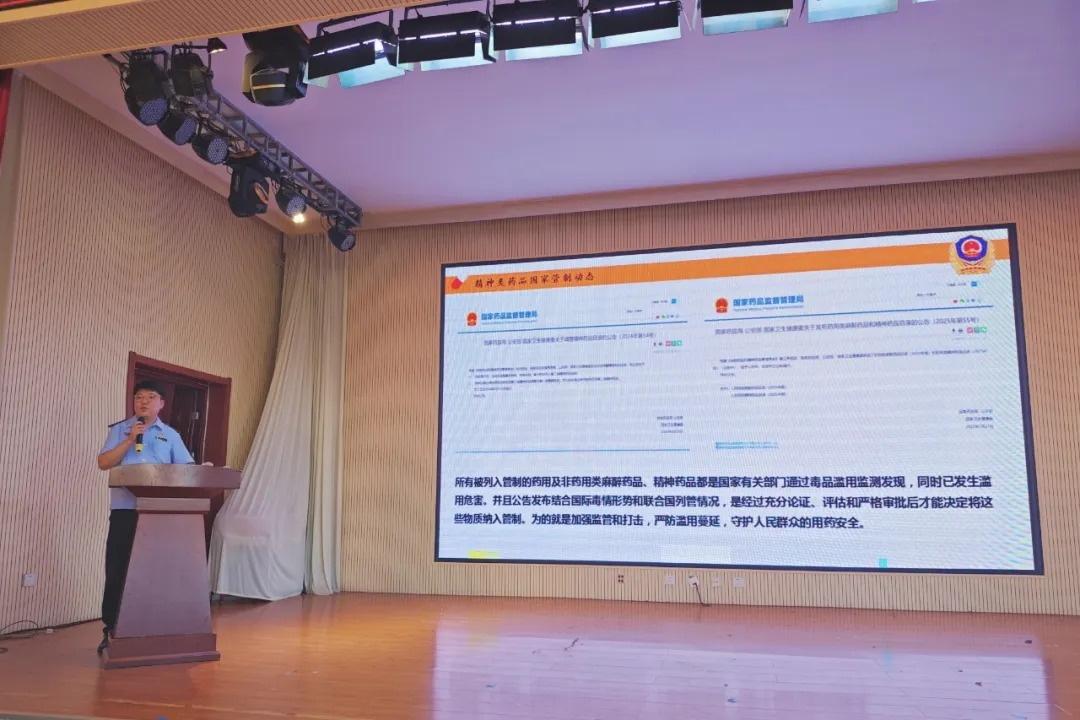 活動(dòng)中,葫蘆島市市場(chǎng)監(jiān)督管理局楊家杖子分局工作人員王啟浩通過(guò)PPT演示、發(fā)放宣傳冊(cè)等形式,用通俗易懂的語(yǔ)言對(duì)麻醉藥品和精神藥品進(jìn)行了詳細(xì)介紹,著重強(qiáng)調(diào)了過(guò)量使用麻精類藥品會(huì)對(duì)身體和心理產(chǎn)生危害,輕則使人成癮、失控,誘發(fā)焦慮抑郁,重則導(dǎo)致暴力行為甚至死亡,非醫(yī)療目的的濫用麻精藥品即是吸毒違法行為,告誡同學(xué)們千萬(wàn)不要越過(guò)法律紅線。