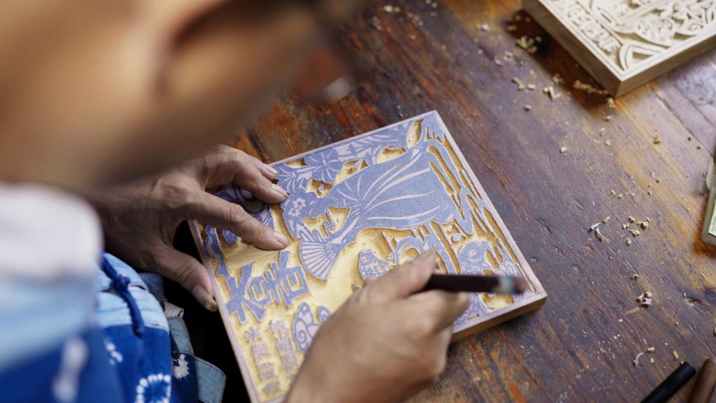 7月5日,喜洲匠志集民藝中心甲馬版畫(huà)藝術(shù)館內(nèi),工匠正在雕刻甲馬。新華社發(fā)(羅曉川攝)