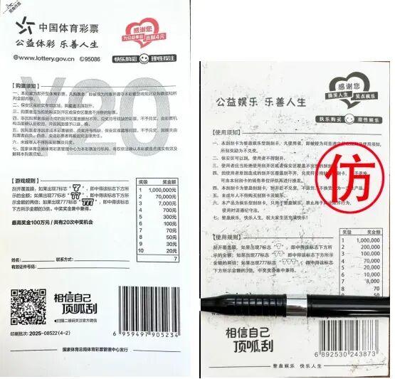 多地發(fā)生兌獎鬧劇,上演了人生倍速版“大起大落”。這些“整蠱彩票”都以即開型體育彩票為主。正規(guī)合法的即開型體育彩票到底長啥樣?根據(jù)國家體育總局體育彩票管理中心發(fā)布的聲明,即開型體育彩票使用環(huán)保紙張和油墨,綠色、健康、易刮開; 保安區(qū)和刮開區(qū)均有覆膜,票面印有防偽裝飾紋,圖案完整;票面印有體彩+頂呱刮標識及面值金額,刮開后的游戲區(qū)域有防偽底紋,且游戲符號、獎金標志清晰易辨別。票背 印有發(fā)行機構、公益金貢獻金額和官方網(wǎng)址等信息。