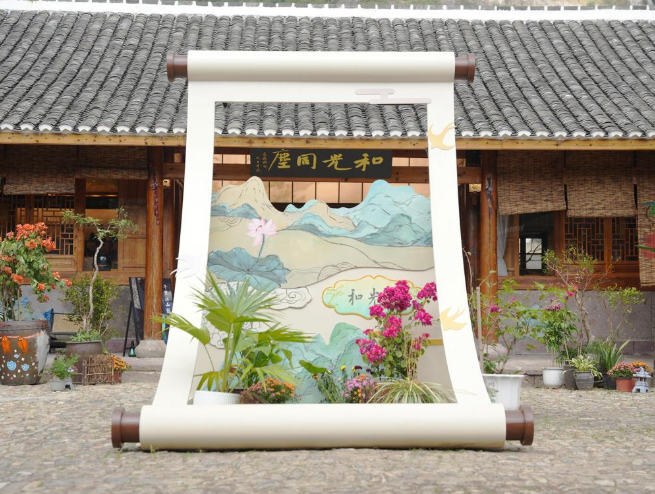 茅洋農(nóng)民畫主題館,坐落于白巖下村和光院,簡單質(zhì)樸的木結(jié)構(gòu)建筑如同形象質(zhì)樸的農(nóng)民畫一樣完美融入這片土地。碩大的藝術畫框裝置像土地生長的藝術容器,既有農(nóng)民畫扎根土地的滾燙,也有文創(chuàng)產(chǎn)品帶著絢麗色彩奔赴日常的輕盈。