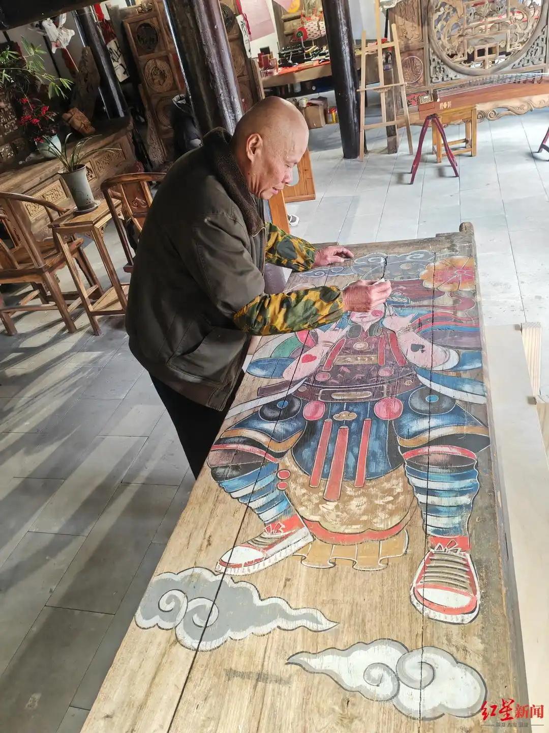 2月10日上午,“萬千氣象看四川”大型主題采訪活動(dòng)走進(jìn)四川南充市閬中古城,在古城北街的門神畫展示中心,省級(jí)非物質(zhì)文化遺產(chǎn)“閬中門神畫”傳承人張桅正在店里一塊木門板上創(chuàng)作門神畫。不同于很多地方是貼門神畫,閬中的門神是直接“畫”到大門上去的,色澤古樸,栩栩如生。