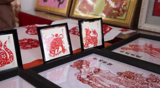 圖為甘肅省平?jīng)鍪徐`臺(tái)縣什字鎮(zhèn)文化廣場(chǎng)文化活動(dòng)室里的剪紙作品