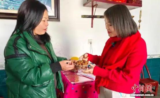 “鄉(xiāng)村CEO”廖紅(右)來(lái)到村民家收購(gòu)?fù)撂禺a(chǎn)。中新社記者 唐小晴 攝