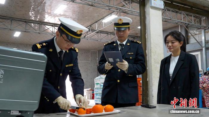 海關(guān)工作人員對橙子進(jìn)行檢測。毛文濤 攝