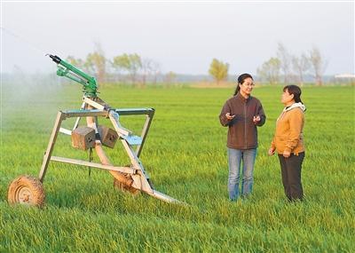 陳世君(左)為村民講解小麥科學灌溉的知識。陳雷 攝