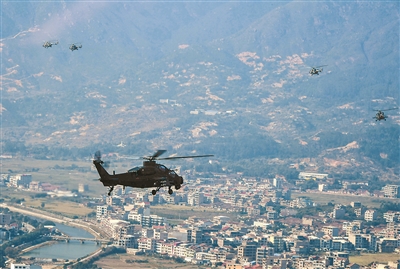 “計時起飛?!鄙衔?時,隨著塔臺指揮員一聲令下,30余架多型號直升機(jī)從閩南某機(jī)場騰空而起,直奔預(yù)定空域,拉開訓(xùn)練帷幕。