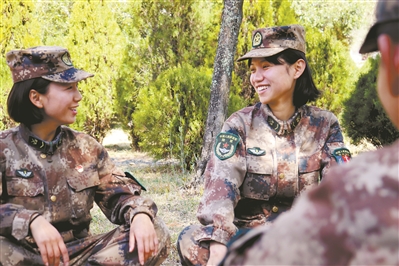 圖為訓練間隙,文曉曼(左二)與戰(zhàn)友談心。
