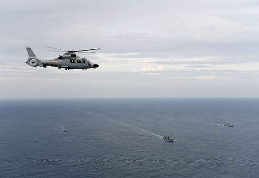 圖為5月14日,海軍第35批護航編隊進行艦機協(xié)同訓練。 江山 攝