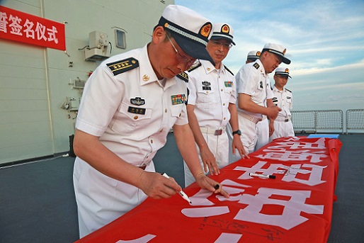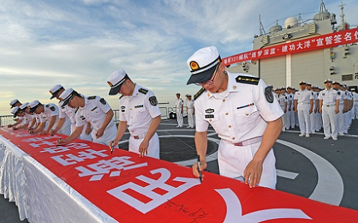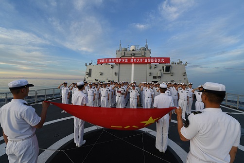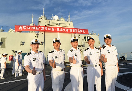 萬里航程剛剛起步,履行使命任重道遠。編隊指揮員紀樂江在宣誓儀式上號召大家,要以通過赤道這一特殊地理原點為新的起點,把逐夢強國強軍、闊步世界一流的雄心壯志,化作鐵心向黨、絕對忠誠的堅定信念,化作直面強敵、敢于亮劍的無畏勇氣,化作嚴謹求實、追求卓越的過硬作風,化作攻堅克難、連續(xù)作戰(zhàn)的頑強斗志,以一流的標準、一流的成績、一流的風采,切實做到不負時代重托、不辱光榮使命。