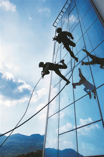 圖為開展高樓索降突擊訓(xùn)練。