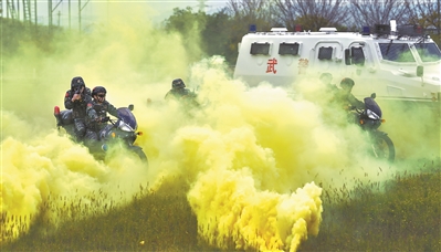 圖為特戰(zhàn)隊(duì)員開展乘摩托車追剿“暴恐分子”訓(xùn)練。