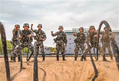 圖③:王宜征(前左)與戰(zhàn)士進行甩繩體能比拼。