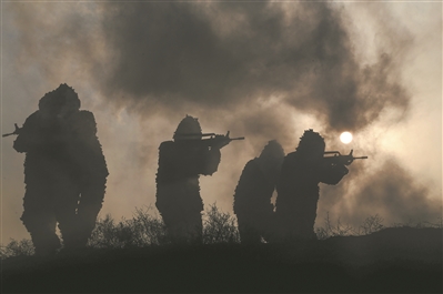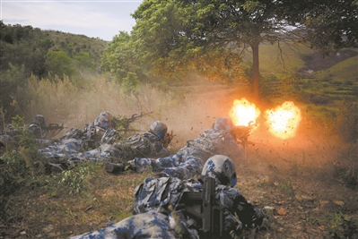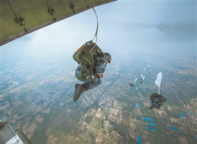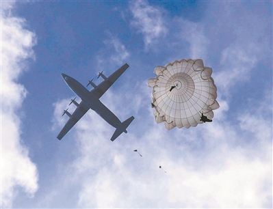“跳!跳!跳!”綠色離機(jī)信號(hào)燈亮起,傘兵從高空躍下,直撲“作戰(zhàn)”區(qū)域。成功著陸傘兵迅速解脫傘具、整理武器裝備,在夜色掩護(hù)下向目標(biāo)地域發(fā)起沖擊。