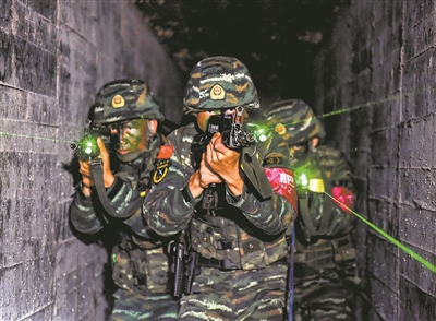 武警合肥支隊特戰(zhàn)小隊官兵研究地形后,決定采取“正面佯攻、側(cè)翼突入”戰(zhàn)術(shù)實施捕殲。封控小組分別從兩個方向隱蔽接近洞口,防止“暴恐分子”逃脫。突擊組官兵攜警犬進入山洞后,以迅雷不及掩耳之勢進行突擊,迅速將“暴恐分子”制伏。