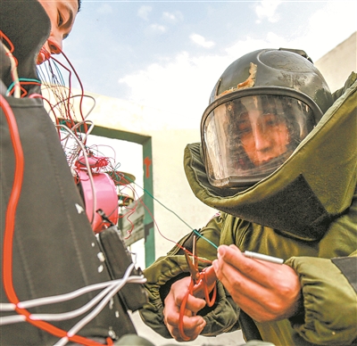 演訓場上,其他演練課目接連展開,砥礪官兵實戰(zhàn)能力。某大隊應用激光模擬對抗系統(tǒng),組織紅藍對抗;排爆分隊設置復雜現(xiàn)場環(huán)境,排除“人質”身上捆綁的“爆炸物”;偵察分隊實施抵近偵察,開展突入房屋訓練……