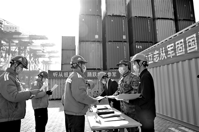 1月30日,山東省港口集團在某碼頭作業(yè)現場設立征兵咨詢站,為大學生員工解答征兵政策。黃向東 攝