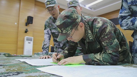 圖為李曦(中)以圖上作業(yè)形式與戰(zhàn)友進(jìn)行戰(zhàn)法訓(xùn)法研究。李元昊 攝