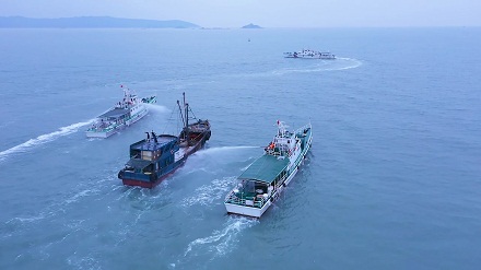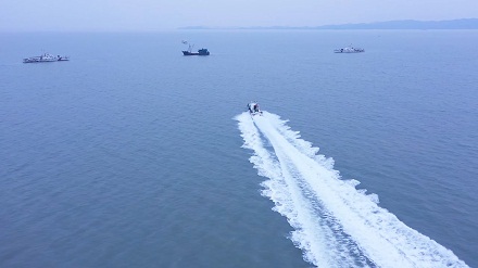 海警摩托艇全速追捕嫌疑船舶。