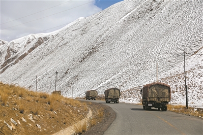 急行110公里,車隊來到庫地達坂。車窗外,一邊是千仞絕壁,一邊是陡崖深谷?!皫斓剡_坂是新藏線上的第一個冰雪達坂,地勢險要……”駕駛員話音未落,一塊石頭便從山上掉落到車旁,所幸有驚無險。