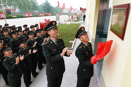 第83集團軍某旅“紅一連”官兵在連隊門前懸掛“星火燎原”育人基地牌匾。張永進 攝
